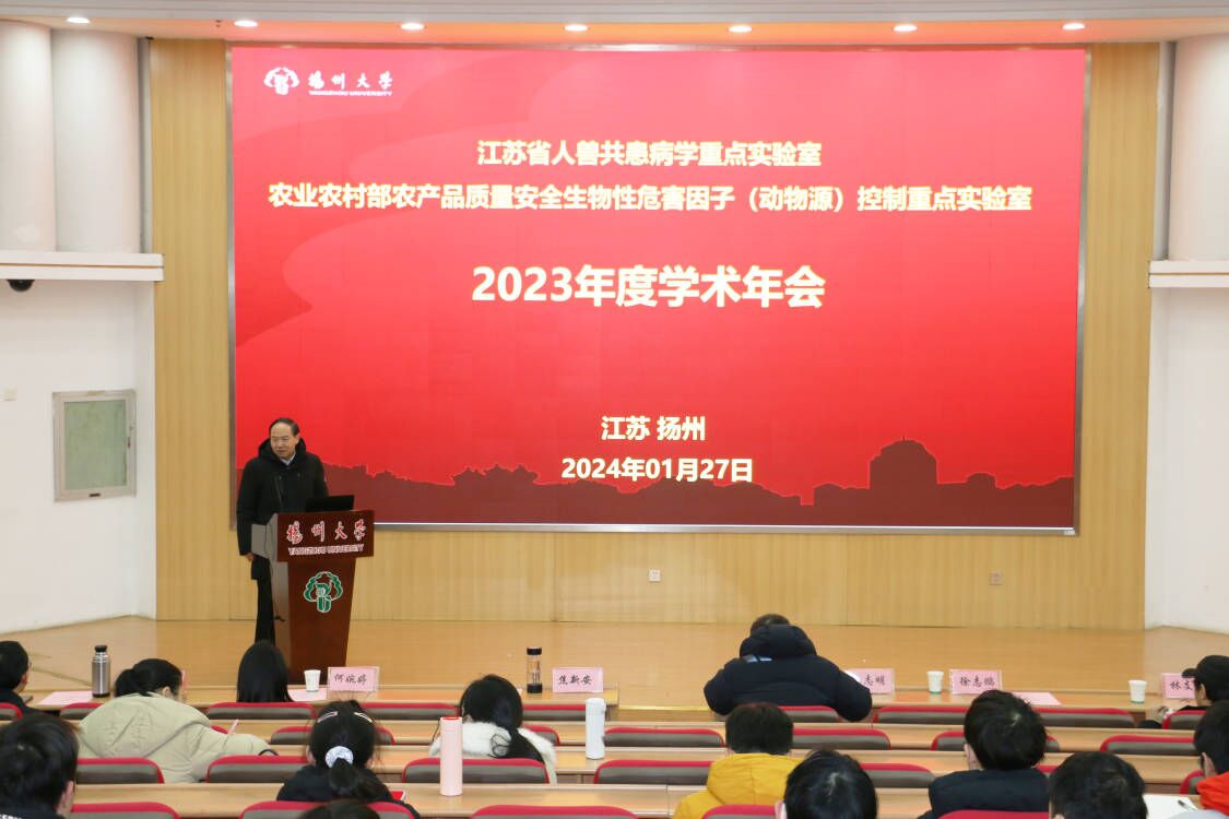 2024年1月27日,江苏省人兽共患病学重点实验室/农业部农产品质量安全生物性危害因子(动物源)控制重点实验室2023年度学术会议在扬州大学荷花池校区图书馆报告厅顺利召开。校党委书记、实验室主任焦新安教授致辞,我院副院长、实验室副主任陈祥教授主持会议,实验室师生150余人参加会议。会议邀请了来自扬州大学数学科学学院林支桂教授、扬州大学医学院张评浒教授、中国药科大学药学院何婉婷教授以及南京医科大学基础医学院徐志鹏教授等相关领域专家学者进行学术报告。与会人员对动物疫病防控以及食品安全相关的热点问题进行了充分的讨论与交流。本次会议的圆满举办不仅促进了同行之间的交流,也进一步推动了实验室多学科研究的创新发展。