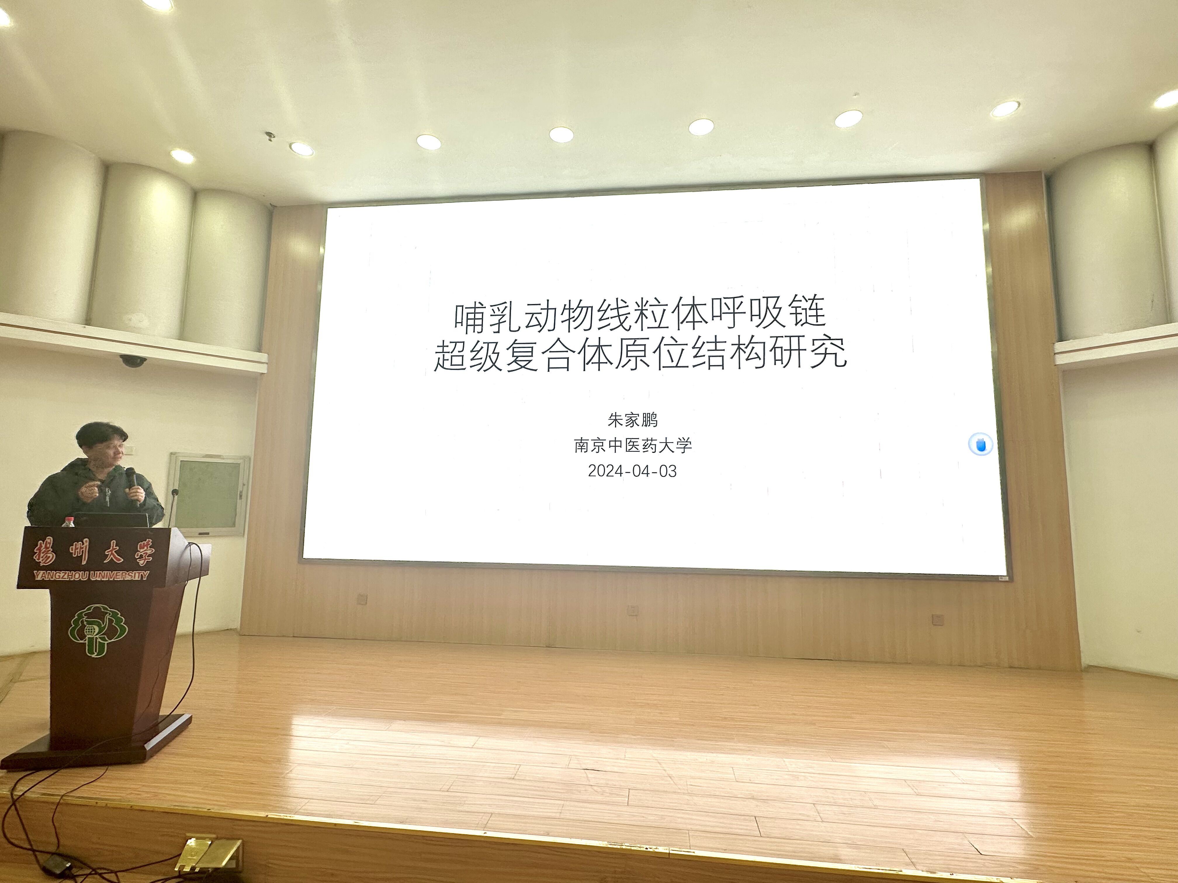 朱家鹏教授以“哺乳动物线粒体呼吸链超级复合体原位结构研究”为题,从冰冻电镜Cryo- EM的原理入手,介绍了其在单颗粒三位重构、膜蛋白提纯等领域的应用。讲解了利用原位冷冻电镜方法解析高分辨率呼吸链超级复合体结构的研究,为线粒体氧化磷酸化过程结构分子生物学研究方式以及催化机理的深入研究提供结构基础。
