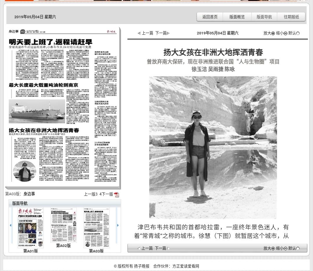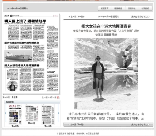 5月4日,省内发行量最高的纸媒《扬子晚报》大篇幅刊登文章《扬大女孩在非洲大地挥洒青春》,报道我院大学生徐慧在艰苦的岗位上奉献青春的感人事迹。