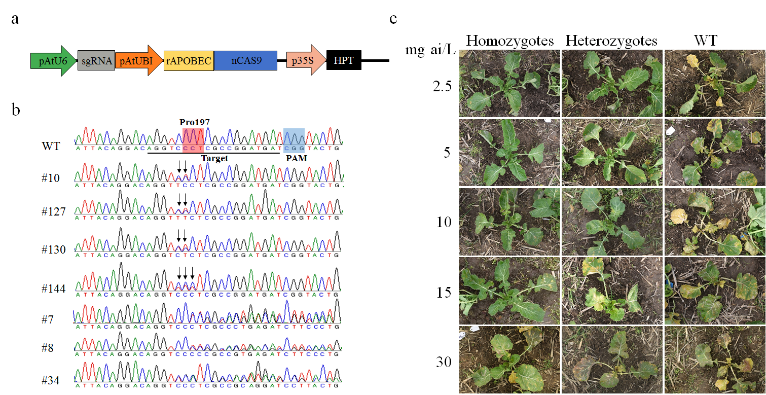 杂草危害可使油菜籽产量下降15.8%,严重的田块减产幅度可达50%以上。培育抗除草剂油菜新品种是增加油菜产量、实现油菜规模化种植的重要举措。该研究利用CRISPR/Cas9介导的胞嘧啶碱基编辑技术,在BnALS1基因中引入了P197S和P197F的突变,碱基编辑效率可达到1.8%。通过对后代的筛选,在T1代就获得不含转基因成分的纯合突变材料。研究发现野生型植株在2.5mg ai/L浓度的苯磺隆就受到严重药害,而 P197S纯合突变体和杂合突变体分别在15 和10 mg ai/L(3倍田间推荐喷施剂量)的浓度下均未表现任何药害症状,且纯合突变体在30 mg ai/L剂量下仍然能存活。该研究还开发该抗除草剂位点的特异功能分子标记,可用于油菜抗除草剂分子标记辅助选择育种。