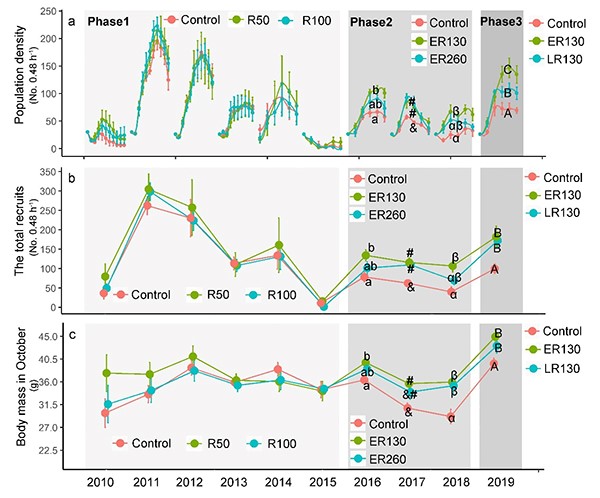 我院魏万红课题组与中国科学院动物研究所张知彬研究员领导的合作团队,在内蒙古锡林郭勒盟锡林浩特市毛登牧场,建立了24个大型的生态因子模拟实验围栏,以布氏田鼠为研究对象分析气候变化下降水模式的改变对布氏田鼠种群暴发的影响(图1)。该研究采用泵压喷灌控制降水时间和强度,通过10年研究时间,标记和重捕布氏田鼠18452只,调查植物样方3000块。发现降雨增加对鼠类种群暴发至关重要,春季(5-6月)的增雨可显著促进布氏田鼠喜食植物的返青、发芽提前、生物量增加,进而促进了布氏田鼠的生长和繁殖(图2);但夏季(7-9月)增雨的效应不明显,如果降雨过多,反而会因雨水灌洞导致田鼠溺亡(图1b),不利种群增长。该研究成果揭示了布氏田鼠种群暴发的气候驱动因子及机制,阐明气候变化的复杂生态学效应,对于开展生物灾害预警与防控以及生物多样性保护具有十分重要的意义。