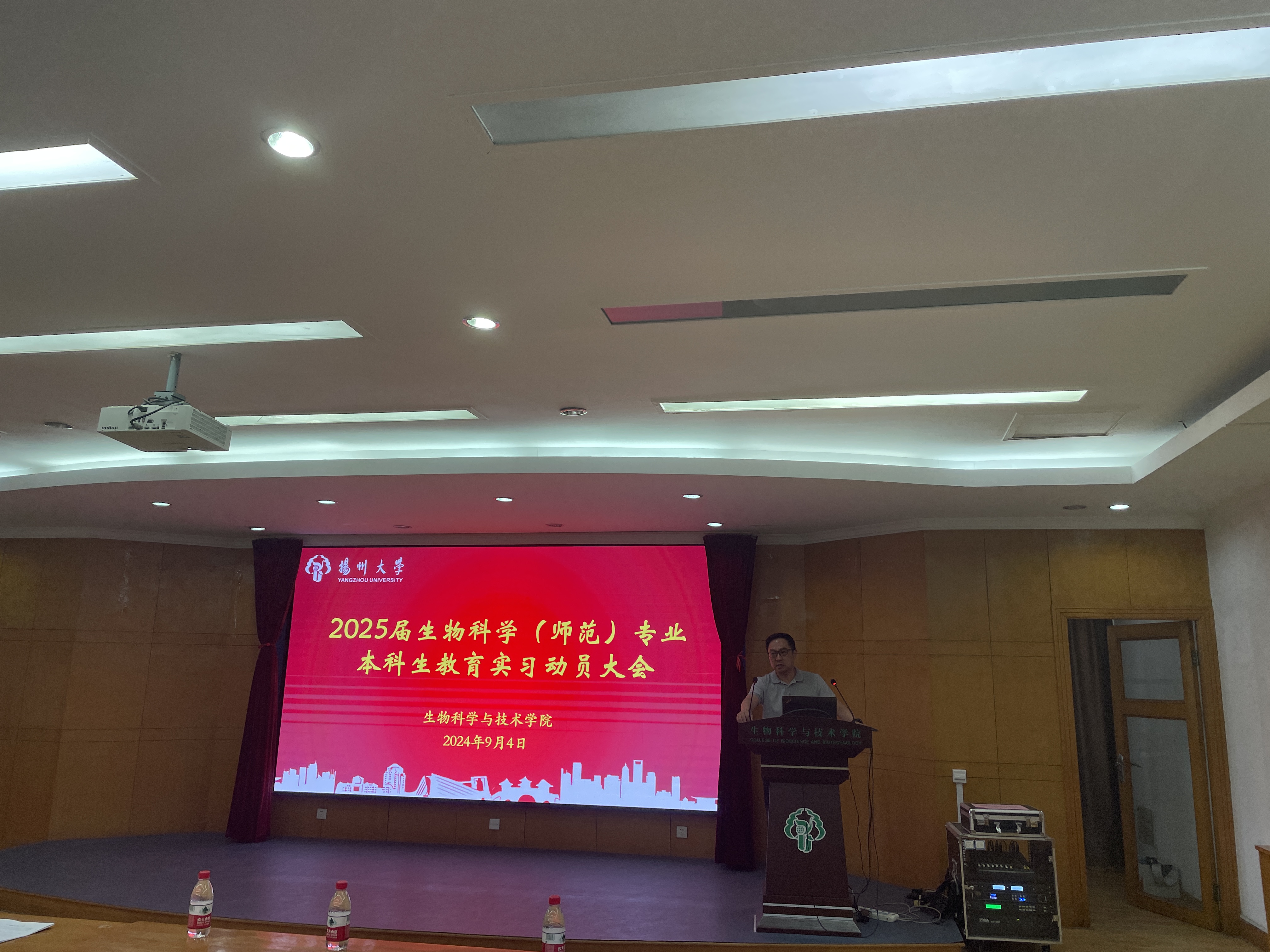 9月4日上午,我院在8号楼二楼报告厅召开了2025届生物科学(师范)专业本科生教育实习动员大会。会议邀请了扬州大学附属中学生物特级教师吴红漫老师为学生进行教育实习专题讲座。副院长陈祥、生科系主任陈刚、教育实习带队教师吴晓霞、徐小颖以及我院全体21级生科专业本科生参与会议,动员大会由吴晓霞老师主持。