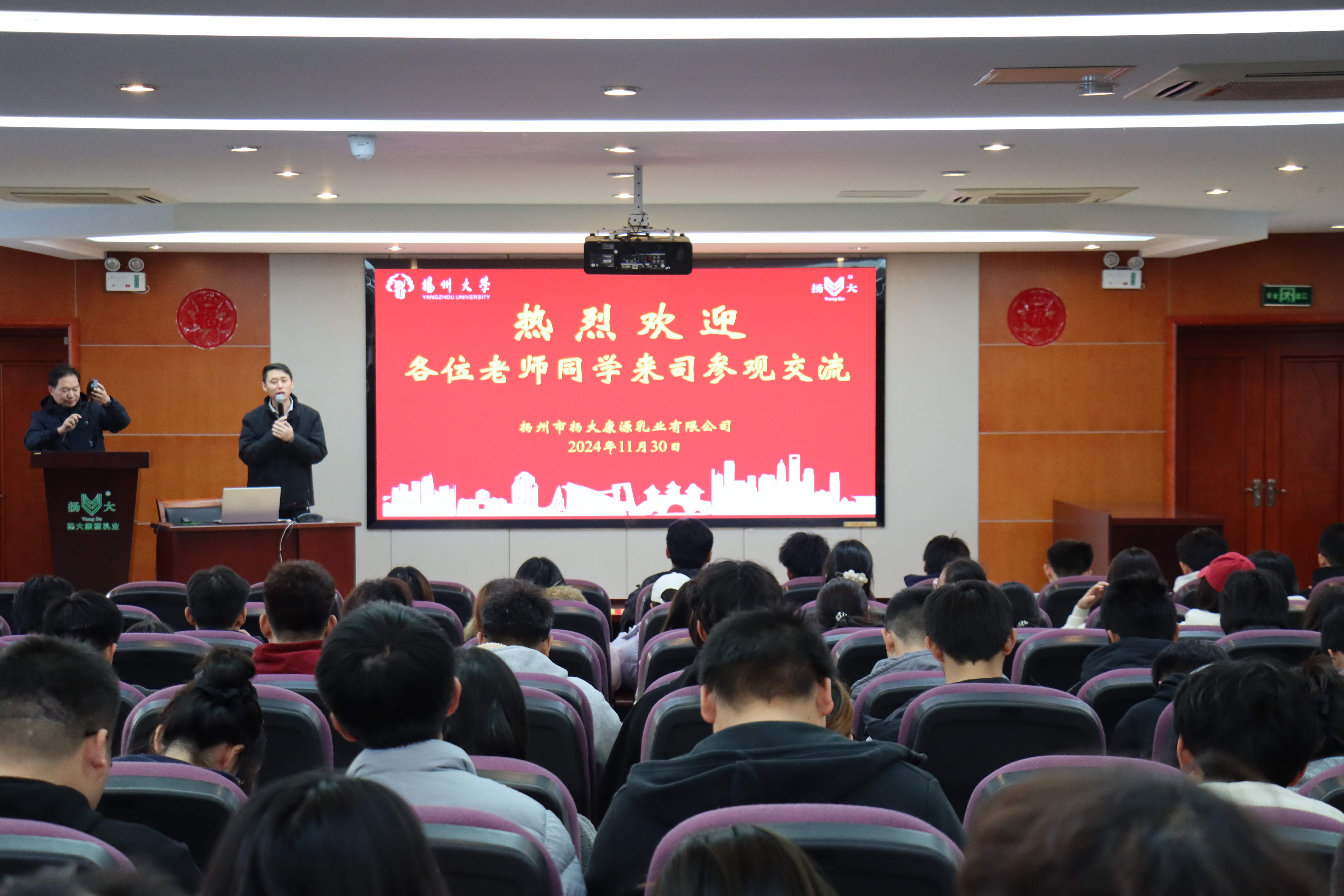 在扬州大学实验农牧场,师生们在工作人员的带领下,参观了现代化养殖区,深入了解现代化农业管理模式、生态养殖技术及智慧农业的应用。通过工作人员的细致讲解,学生们直观感受到科学技术在农业领域的实际应用,并了解到实验农牧场在教学、科研和生产实践中的重要作用。
