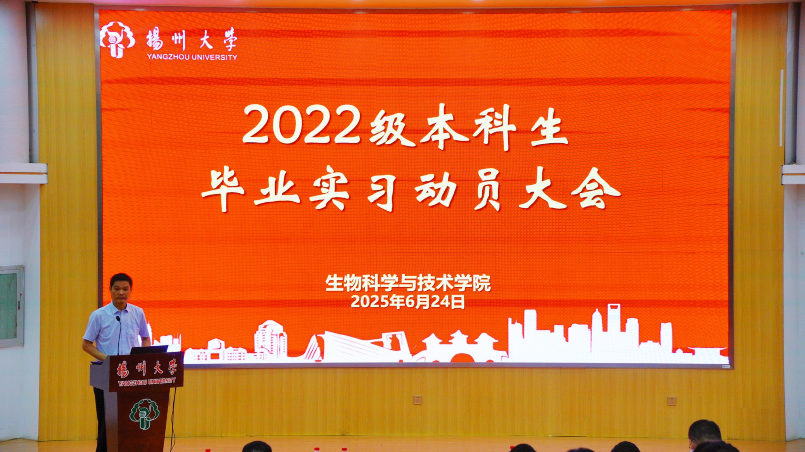 为切实做好2022级本科生毕业实习工作,明确实习任务与要求,引导学生做好实习准备,确保实习质量与安全,我院于2025年6月24日上午8:30在逸夫楼报告厅召开毕业实习动员大会。学院副院长陈祥、党委副书记廖善光、各系主任、团委、教学管理办公室相关老师、全体班主任及2022级全体本科生参加了会议。会议由党委副书记廖善光主持。