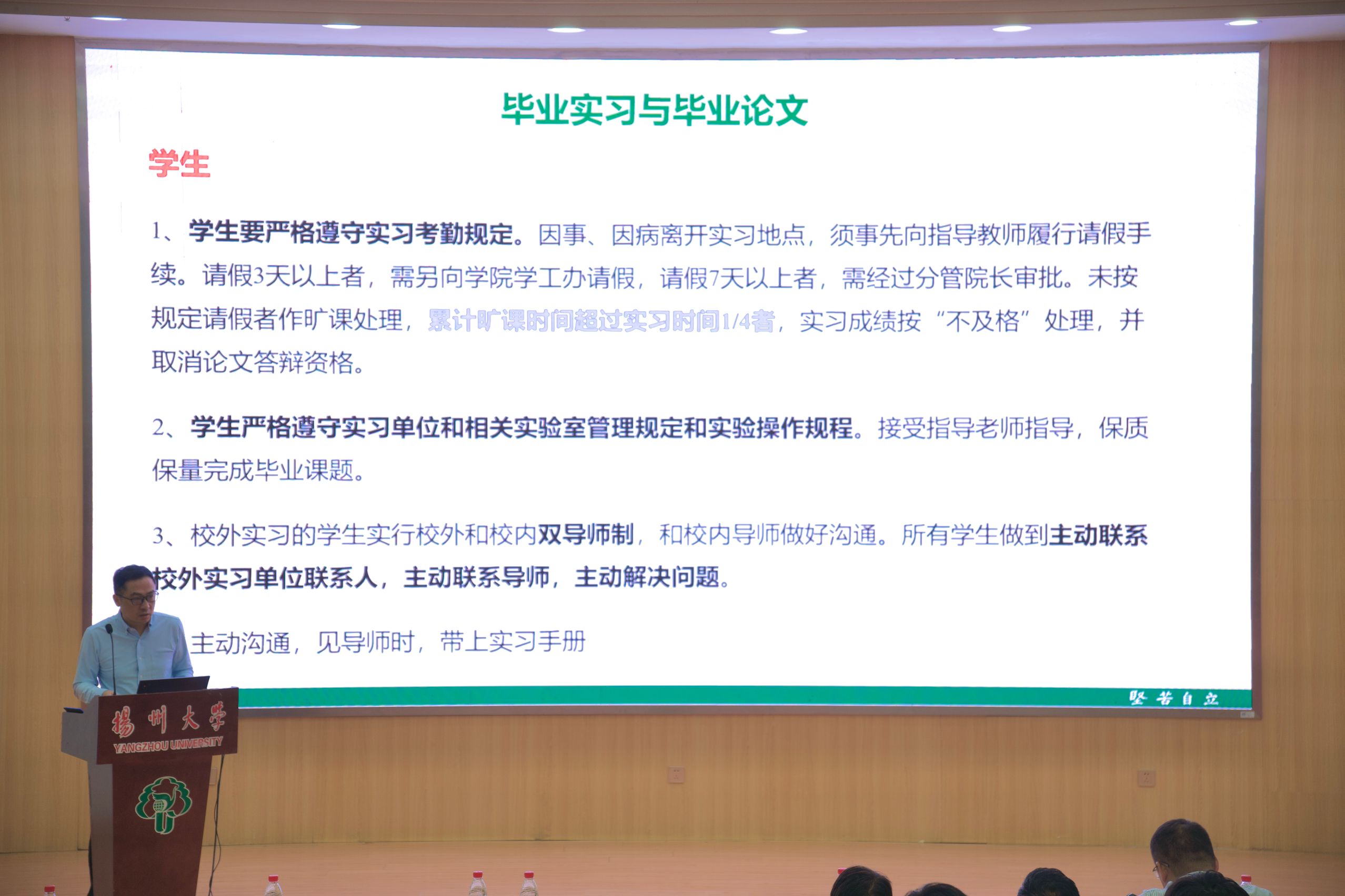 会上,教学办黄亮亮老师详细介绍了本次毕业实习的整体计划、各阶段重要时间节点,并重点讲解和现场演示了学院实习管理系统的操作流程。团委陈晟老师就《生物科学与技术学院本科生毕业实习管理规定》 进行了深入解读。他着重强调了实习期间的安全纪律、行为规范、请销假制度,要求全体同学务必强化安全意识,严格遵守实习单位和学校的各项规章制度,确保实习过程安全有序,学有所成。最后,陈祥副院长作总结动员讲话。他对即将奔赴实习岗位的2022级全体同学提出三点殷切期望:一要珍惜宝贵机会,积极主动融入实习环境,在实践中深化对专业的理解和认知;二要时刻牢记安全第一,严格遵守各项纪律和规定,展现生科学子良好的精神风貌和道德素养;三要坚持勤于思考、善于发问,努力做到知行合一,不断提升解决实际问题的能力,为未来的职业发展打下坚实基础。