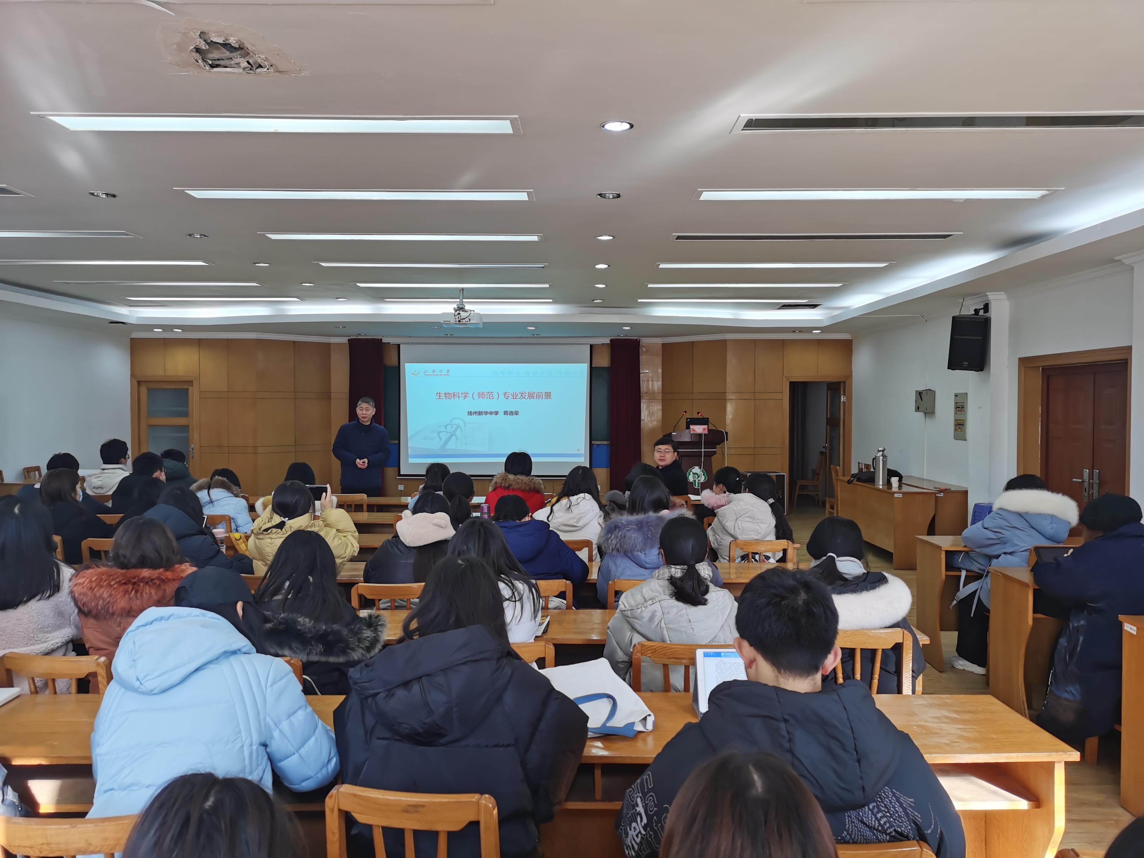 12月15日上午10:00,我院邀请扬州新华中学生物学教师,人民教育家培养对象,江苏省特级教师蒋选荣为生物科学(师范)专业学生以作了《生物科学(师范)专业前景》的报告。