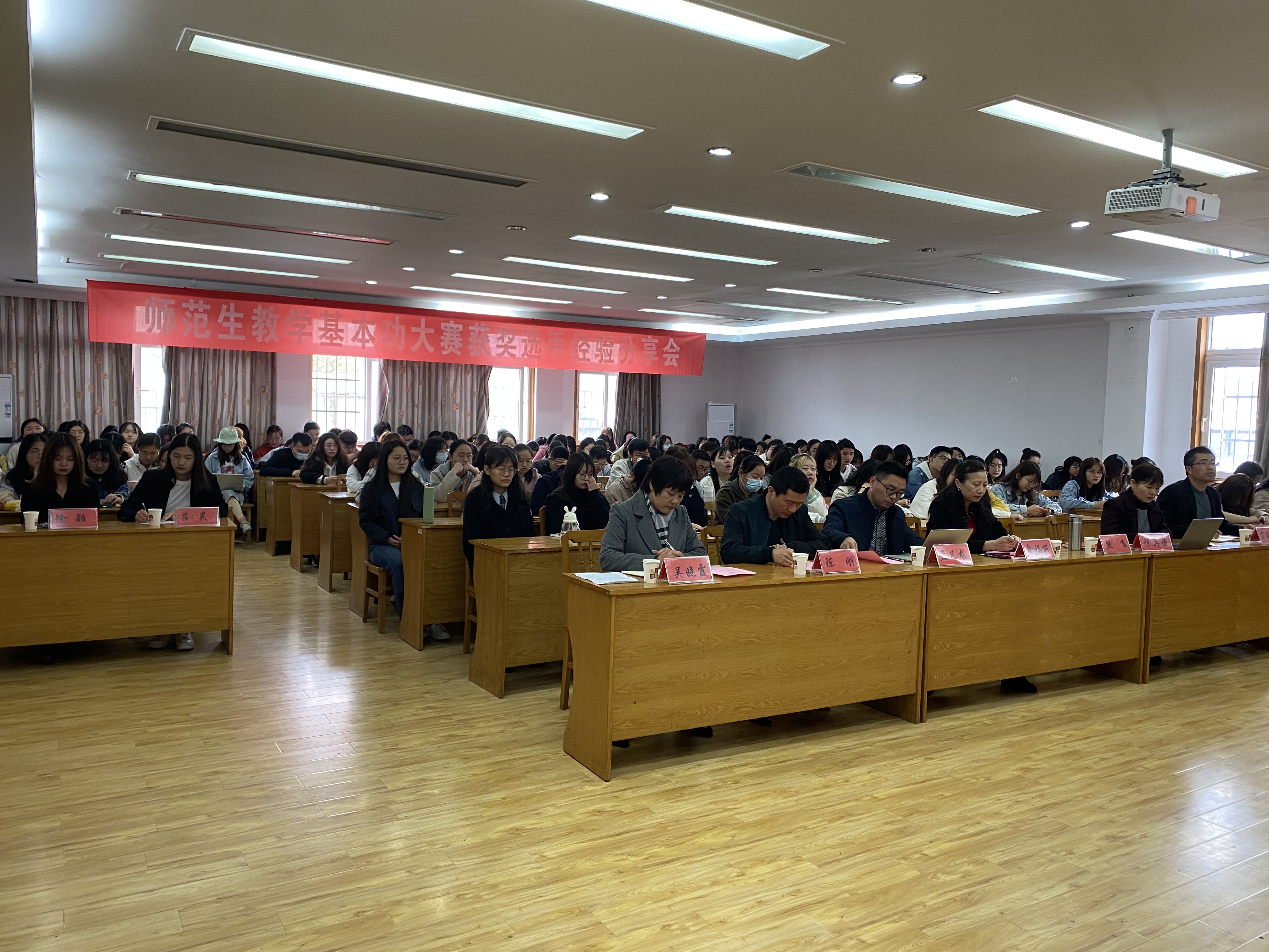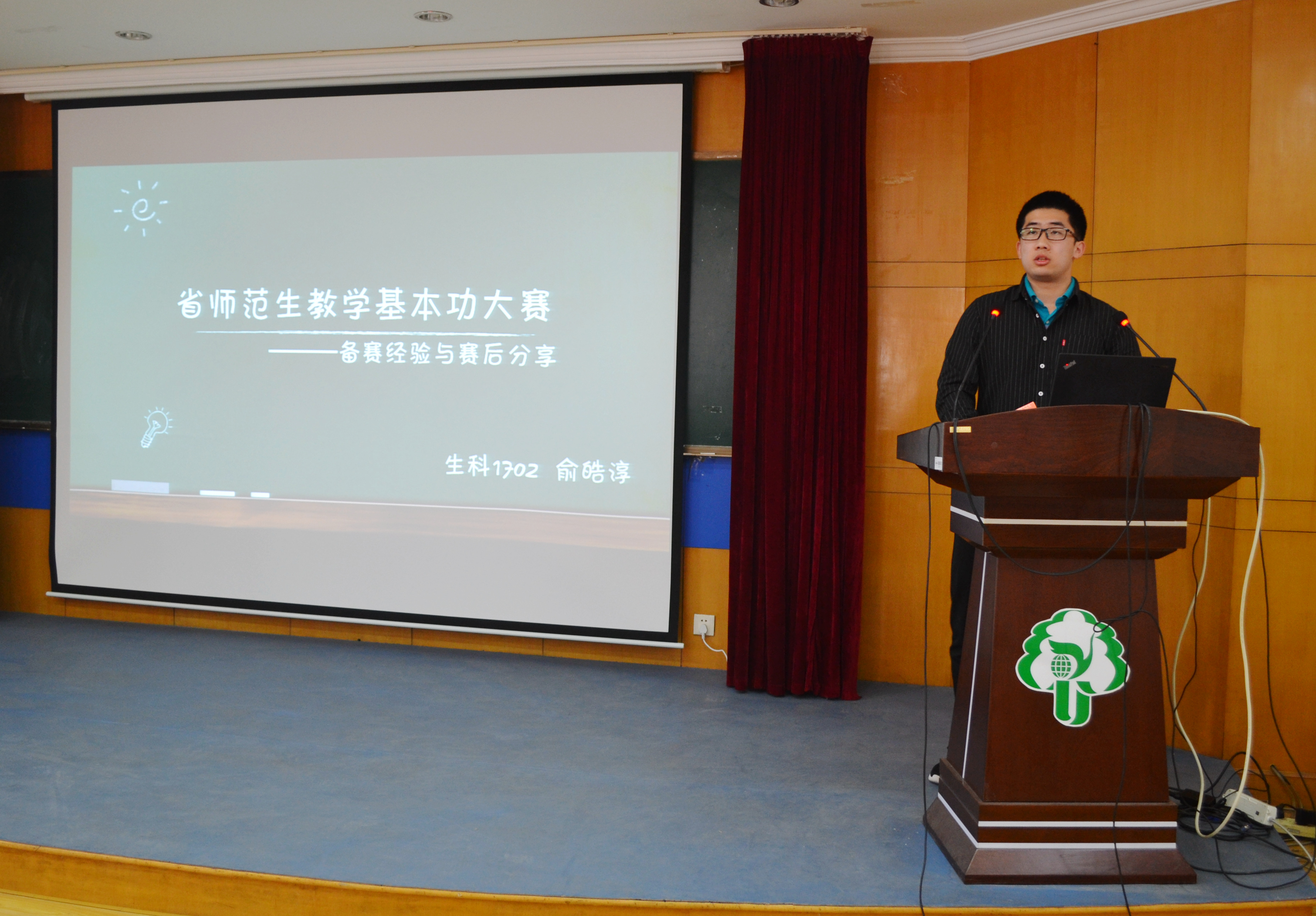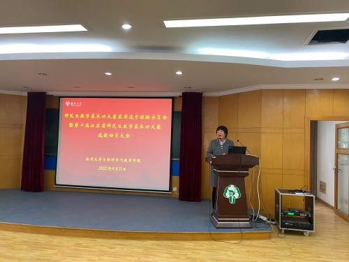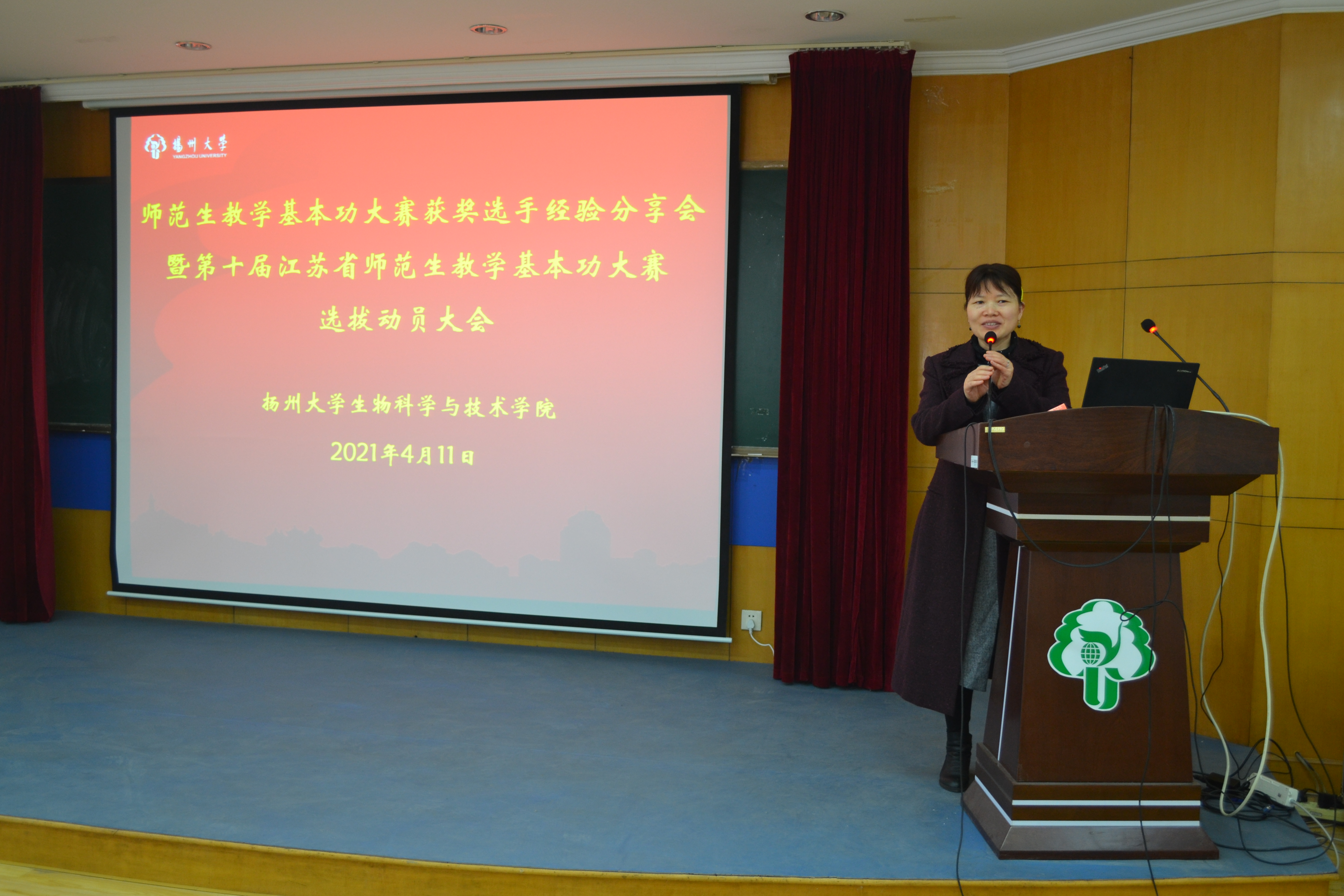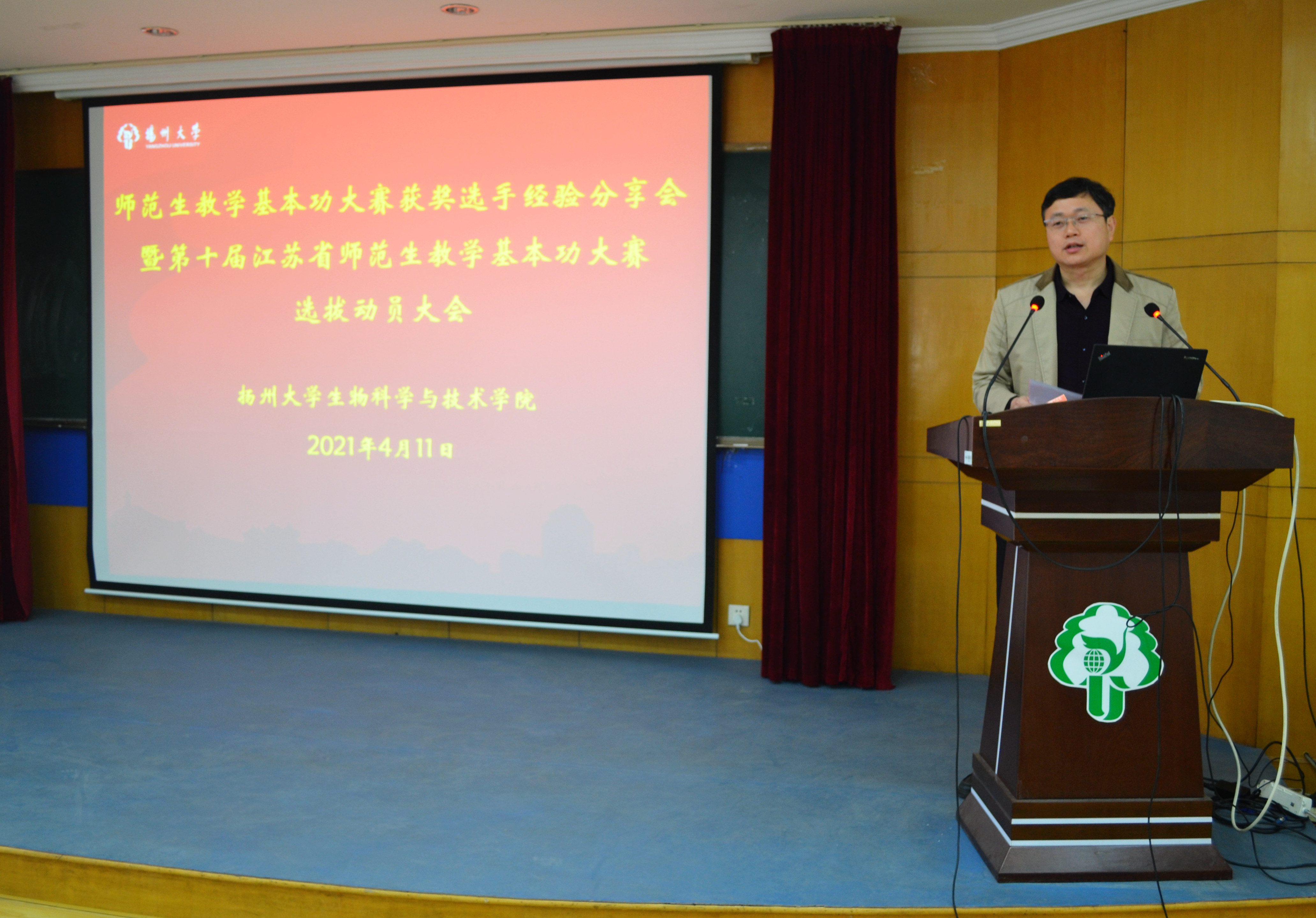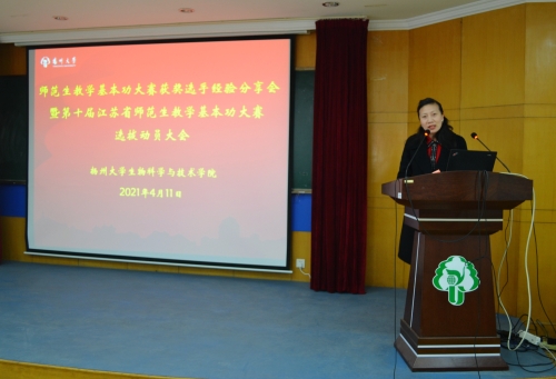 我院成功开展首届师范生教学基本功大赛获奖选手经验分享会暨第十届江苏省师范生教学基本功大赛选拔动员大会2021年4月11日上午9:00,我院在二楼报告厅成功召开生科院首届师范生教学基本功大赛获奖选手经验分享会暨第十届江苏省师范生教学基本功大赛选拔动员大会。本次会议由熊飞副院长主持。教务处副处长俞福丽、扬州大学附属中学东部分校高级教师孟凡龙、生物科学系主任陈刚、副主任丁东海、数科院教学基本功大赛指导教师陈算荣、生科院教学基本功大赛指导教师吴晓霞、数科院教学基本功大赛获奖选手吕昊、生科院教学基本功大赛获奖选手徐颖、俞浩淳以及生科院2018级、2019级生物科学(师范)专业全体学生参加了本次会议。