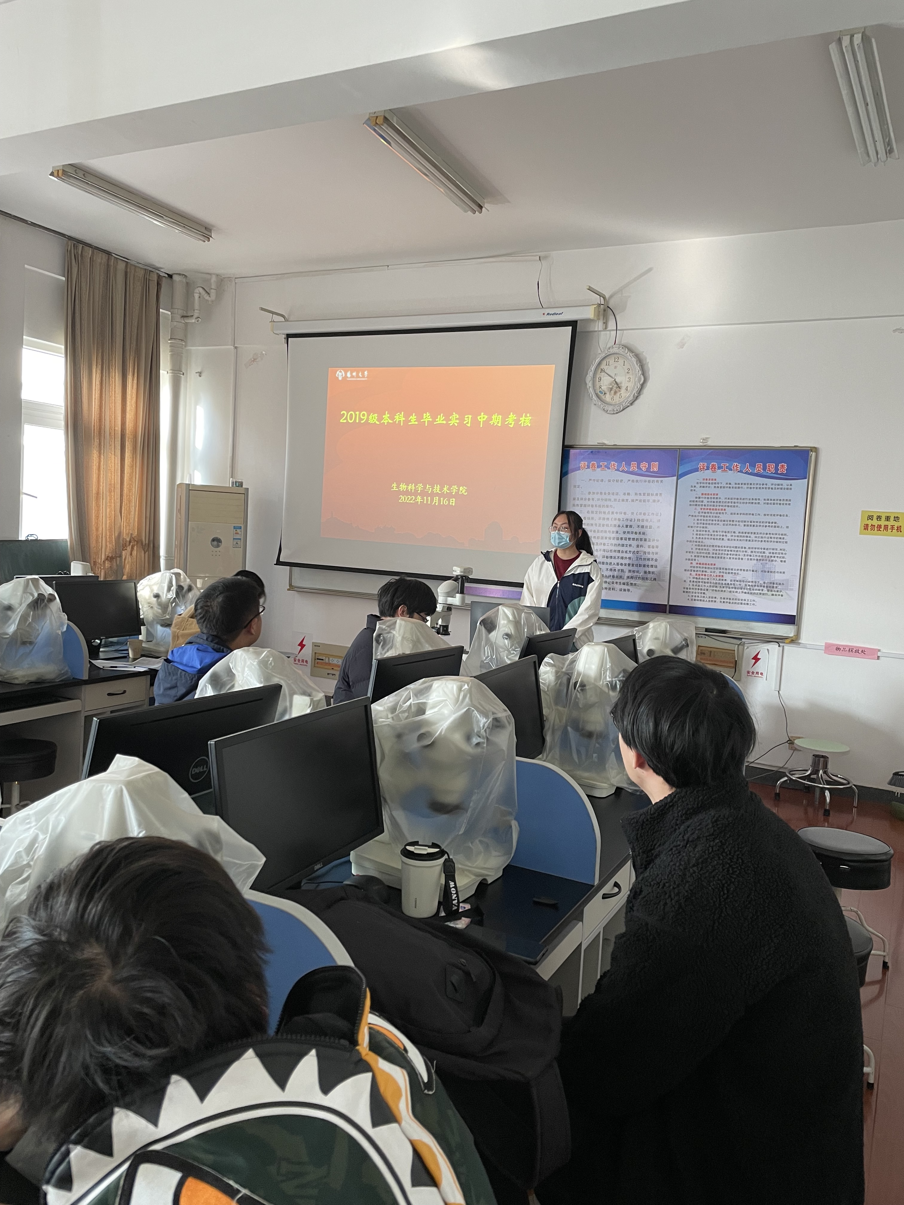 11月16日上午,学院对2019级本科生毕业实习进行中期考核。本次考核分为六组,线上+线下形式进行。生物技术、生物制药专业学生从论文选题、研究进展、试验结果、下一步试验计划等方面进行汇报,生物科学(师范)专业学生则对教育实习的内容、收获体会、下一步工作等进行汇报,考核小组通过提问、审查毕业生实习手册等给予最终评分结果。学院副院长陈祥视察并听取了部分学生的汇报。