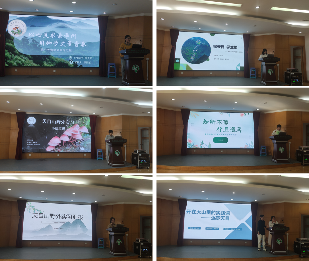 汇报以小组展示的形式开展,各组就小组成员、实习基地、实习经历、标本成果、课题研究、收获及感悟等进行了介绍。各小组以不同形式向大家展示10天实习的成果。同学们表示:这次天目山是在老师的带领下,更是在大自然母亲的带领下将那种原本蕴藏在我们深处的灵魂和知识唤醒的心灵之旅!
