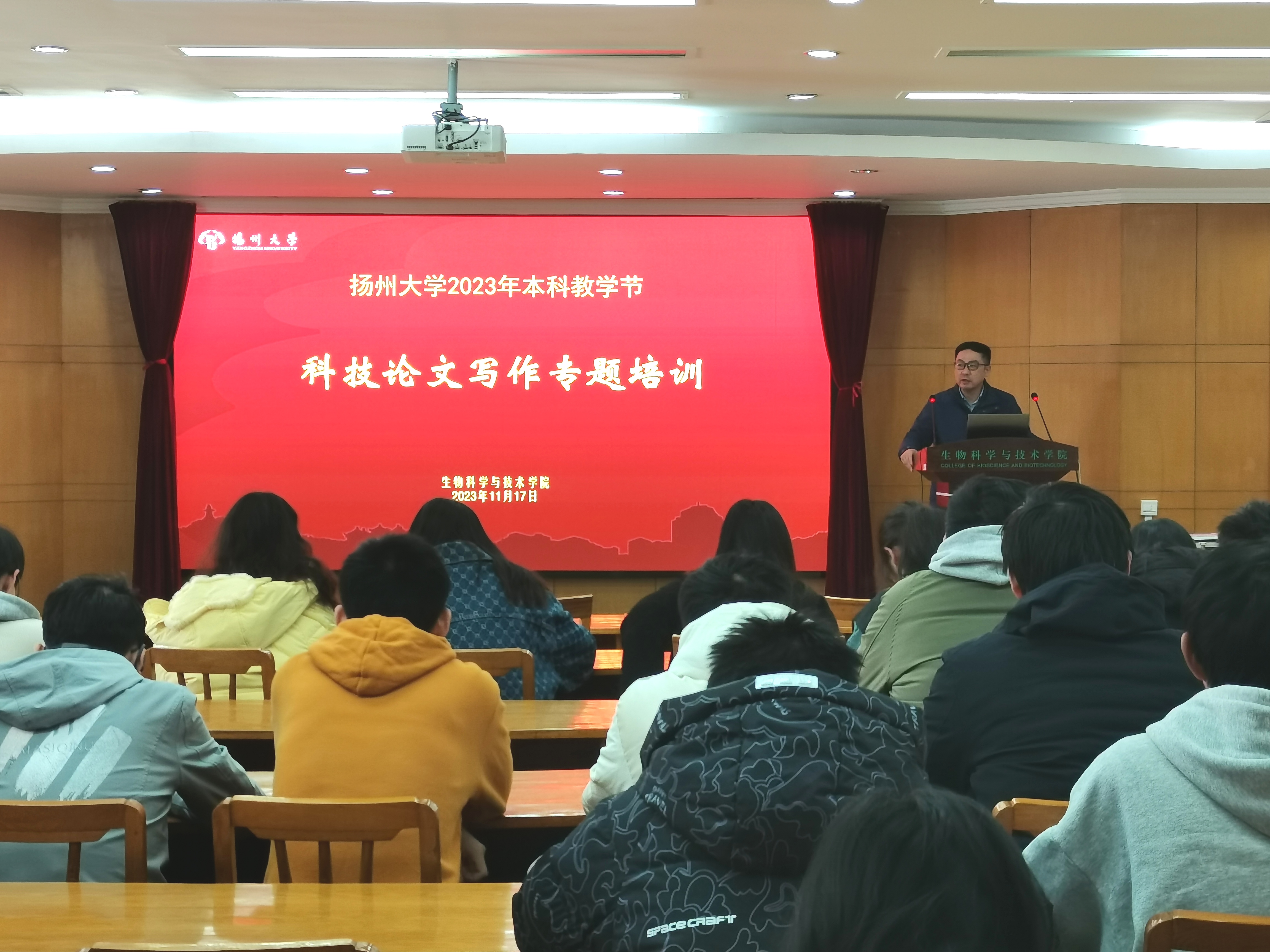 11月17日上午,我院在二楼报告厅开展扬州大学2023年本科教学节系列活动——科技论文写作专题培训。本次培训由科技论文写作负责教师王泽港老师主讲,我院20级毕业班学生参加了培训,培训由教学院长陈祥主持。