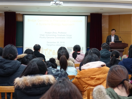2018年12月26号下午,我院邀请了来自美国加州大学戴维斯分校周怀军教授来开展学术报告。周怀军教授是戴维斯分校免疫学、家禽科学、基因组学等研究组成员,担任免疫研究组2018-2021年度主席,还兼任美国农业部(USDA)、美国国际开发署(USAID)相关实验室项目主管,长期从事家禽禽流感、新城疫等传染病宿主免疫应答特性和免疫机理研究。