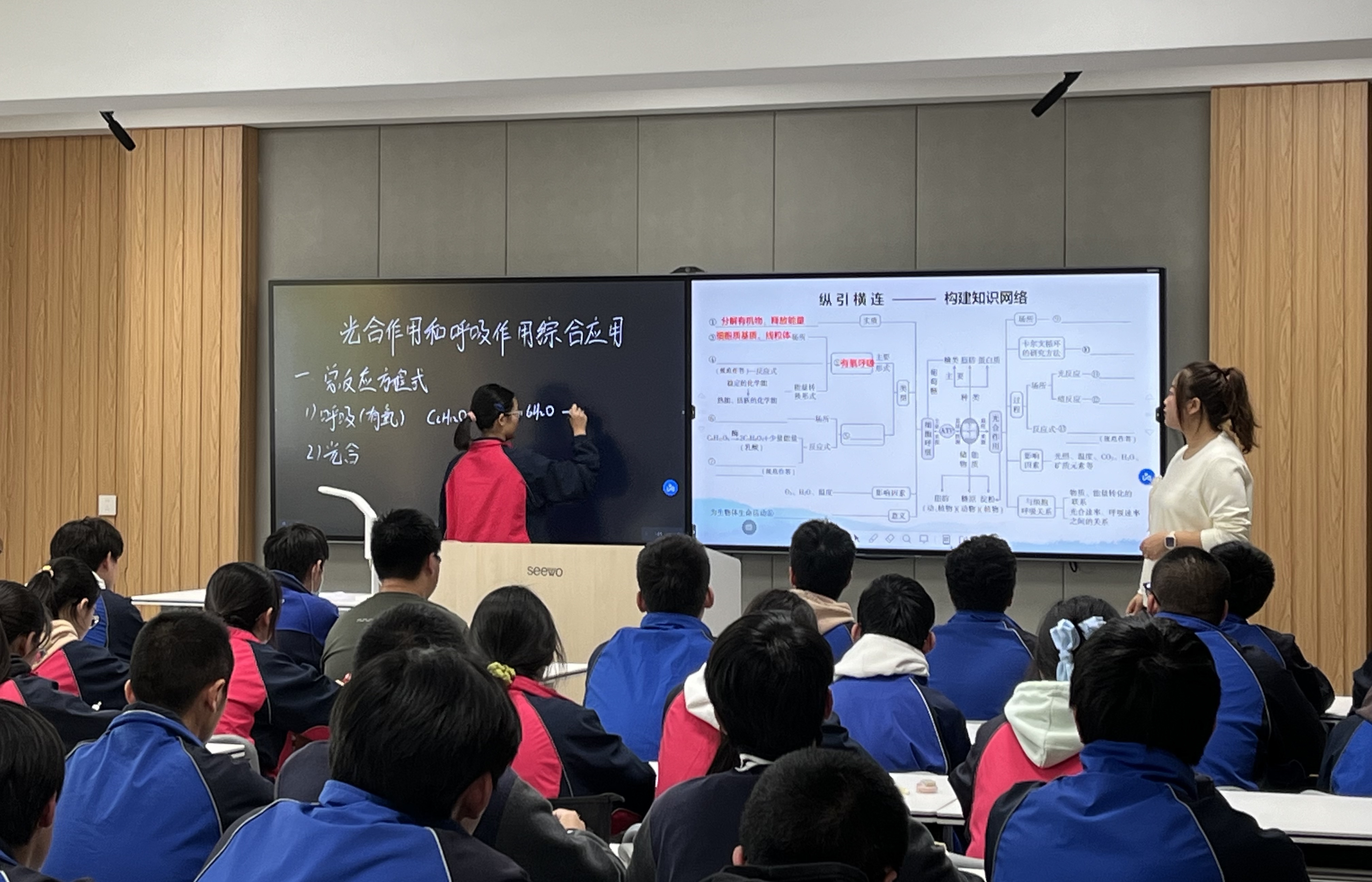 生物科学师范生们观摩了扬州市第一中学高中生物学青年教师郝朵老师面向高三学生开设的“光合作用和细胞呼吸的综合应用”的课堂教学过程。首先,郝朵老师构建光合作用和呼吸作用的知识网络,以此帮助学生建立起完整的知识体系;引导学生探讨光合作用与有氧呼吸之间的联系,并邀请学生上台构建这两个过程的模型。接着,郝朵老师组织学生围绕“光合作用和细胞呼吸中元素的转移途径以及能量的相互联系”开展小组讨论,以期培养学生的物质与能量观。最后,郝朵老师利用表格形式,引导学生比较了光合作用与呼吸作用过程的差异,帮助学生理解同一物质在不同生物反应过程中所扮演的不同角色。通过这节课的观摩学习,师范生们不仅学会了如何在教学过程中引导学生深入理解光合作用与呼吸作用之间的联系,而且领悟到如何提升学生的构建模型和分析模型的能力。
