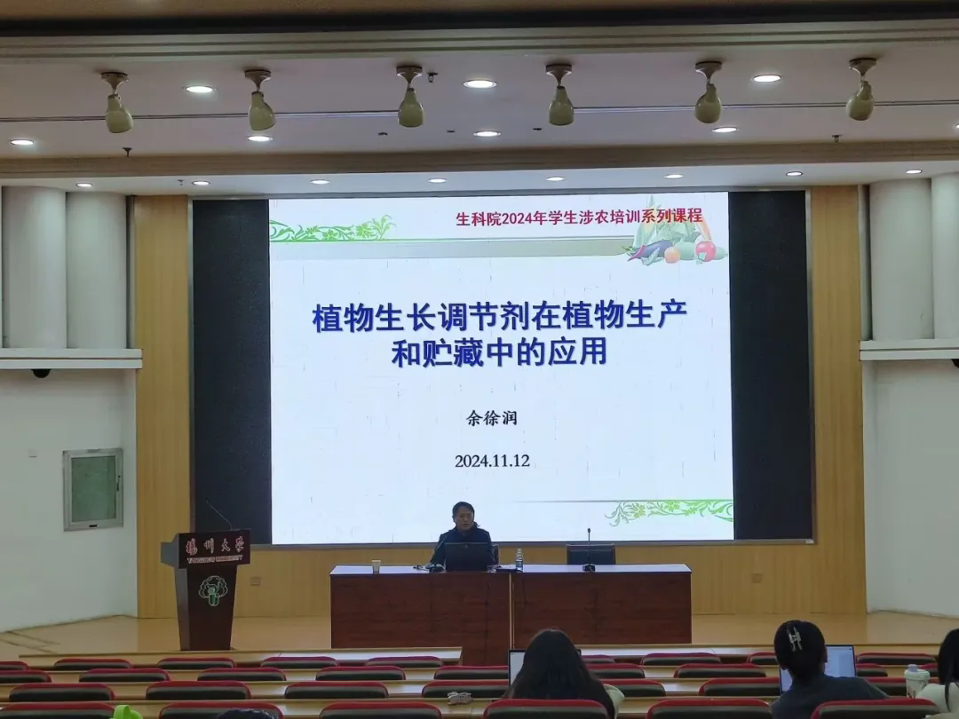 随后,我院副教授余徐润老师主要讲解了植物生长调节剂的来源、作用和实际应用相关知识。从植物生长调节剂概念、分类及应用展开,详细阐述了植物生长调节剂使用过程中的注意事项,以及植物生长调节剂在农业生产上的应用。