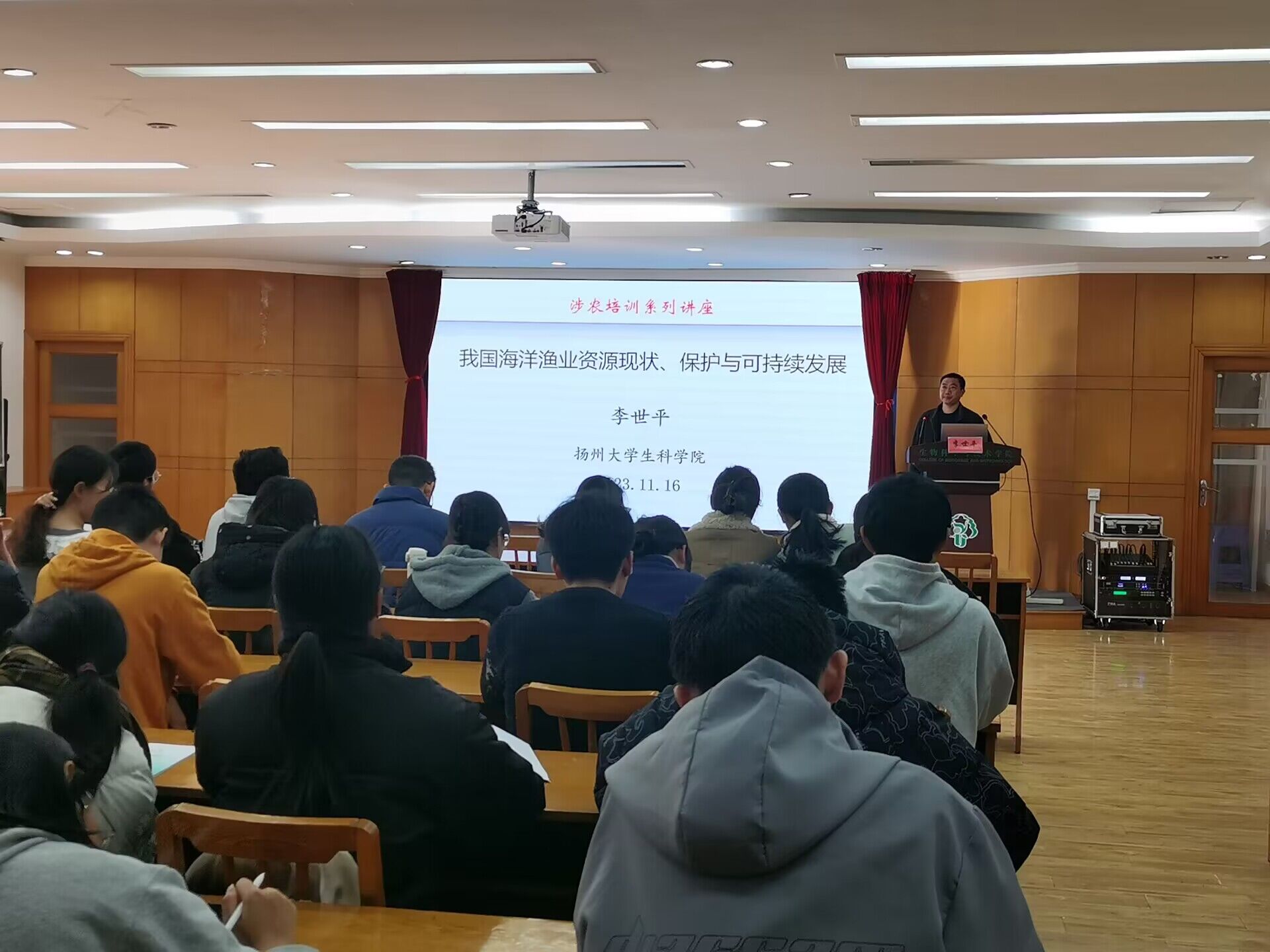 11月16日,下午14:00,在我院生科院报告厅举行2023年大学生创新创业培训,李世平老师从我国海洋渔业资源概况、我国海洋渔业资源面临的问题以及海洋渔业资源保护与可持续发展三个方面展开生动介绍。通过此次培训,同学们了解了职场法则,明白了步入社会的第一步是夯实自己的专业基础,也掌握了更多的专业实用性知识。同学们还认识到了在毕业季面临着新征程、新机遇、新挑战,应当展现出新风貌,砥砺前行,脚踏实地,让青春之花在不懈奋斗中绽放。
