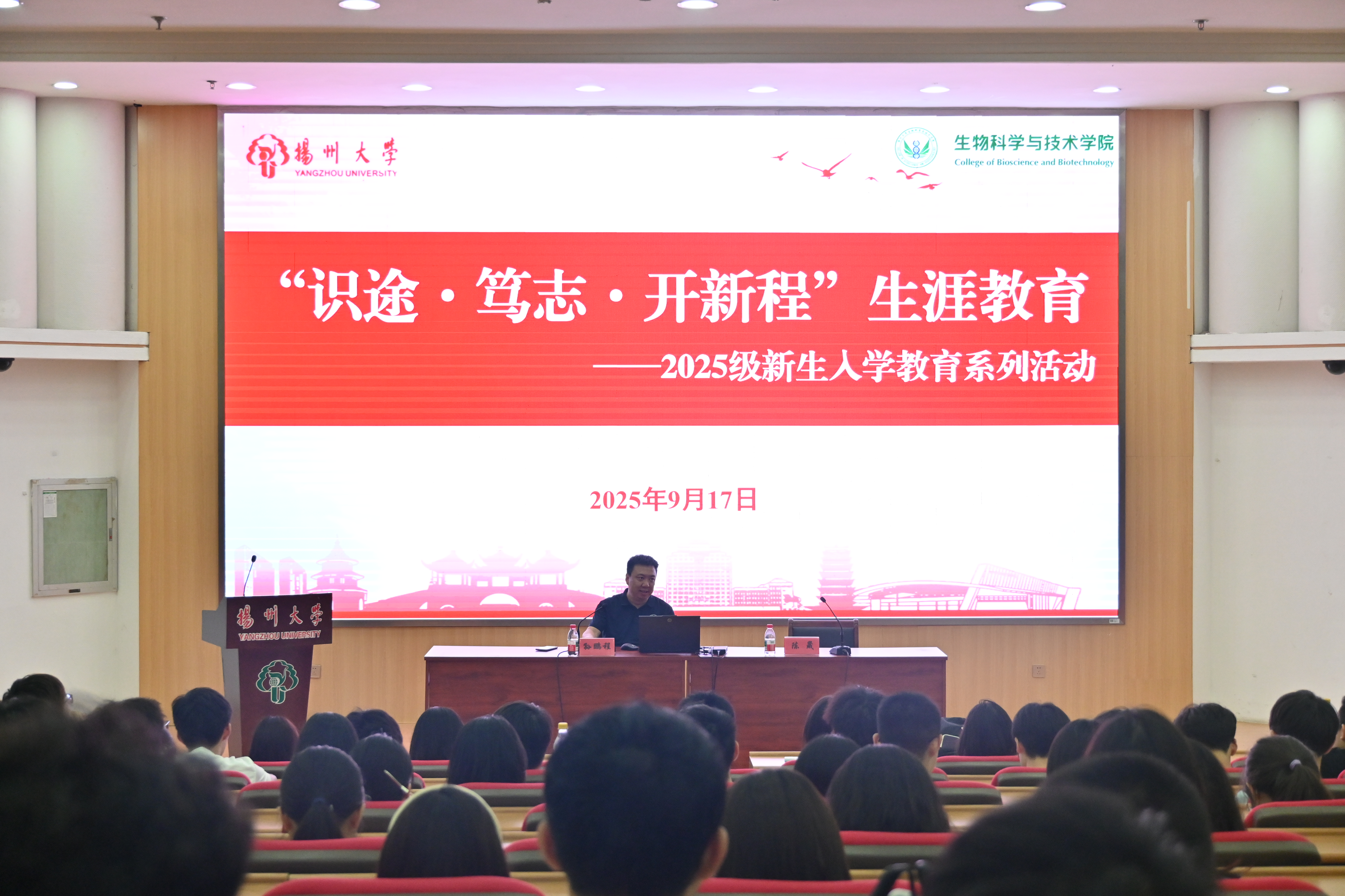 9月17日,学院于荷花池校区逸夫图书馆报告厅举办2025级新生入学教育系列活动——“识途•笃志•开新程”生涯教育。本次大会由辅导员陈晟老师主持,邀请扬州大学招生就业处孙鹏程老师出席。