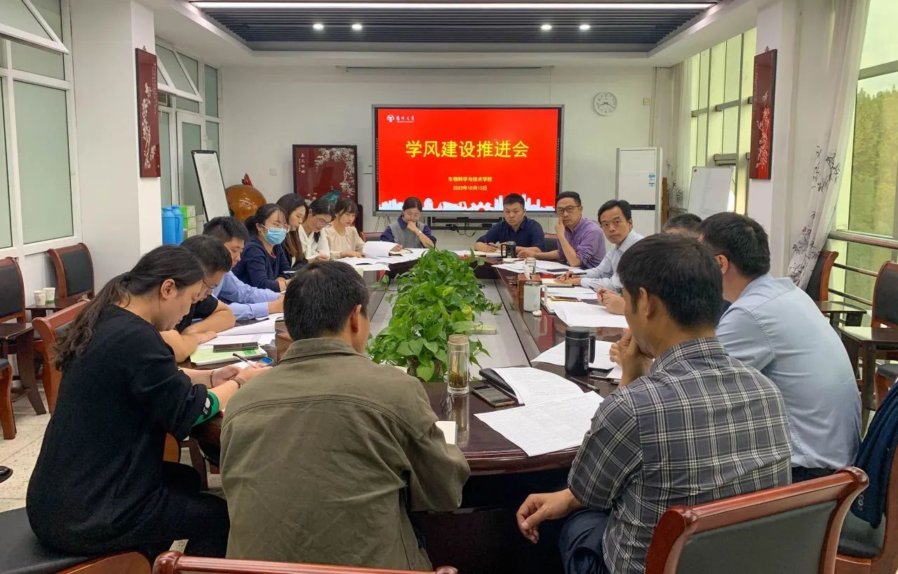 2023年10月13日,学院在8号楼三楼会议室召开2023年学风建设推进大会,会议由院长黄金林主持。党委副书记廖善光通报了学院本科生当前学风的现状及存在问题,并分析了问题产生的原因,形成了《生科学院2022-2023学年学生学业调查报告》现场通报。副院长陈祥、副院长高勇分别报告本科生、研究生学业情况。生物科学系主任陈刚、生物技术系主任吴健和生物制药系教师徐正中分别就各系部当前挂科情况、学风的现状及存在问题进行了通报。本研教务秘书分别就围绕本研学生教务工作进行汇报。院学工办对当前本研学生的学风情况进行了补充,梳理了不及格科目多的学生情况,分析了原因并提出了帮扶措施。