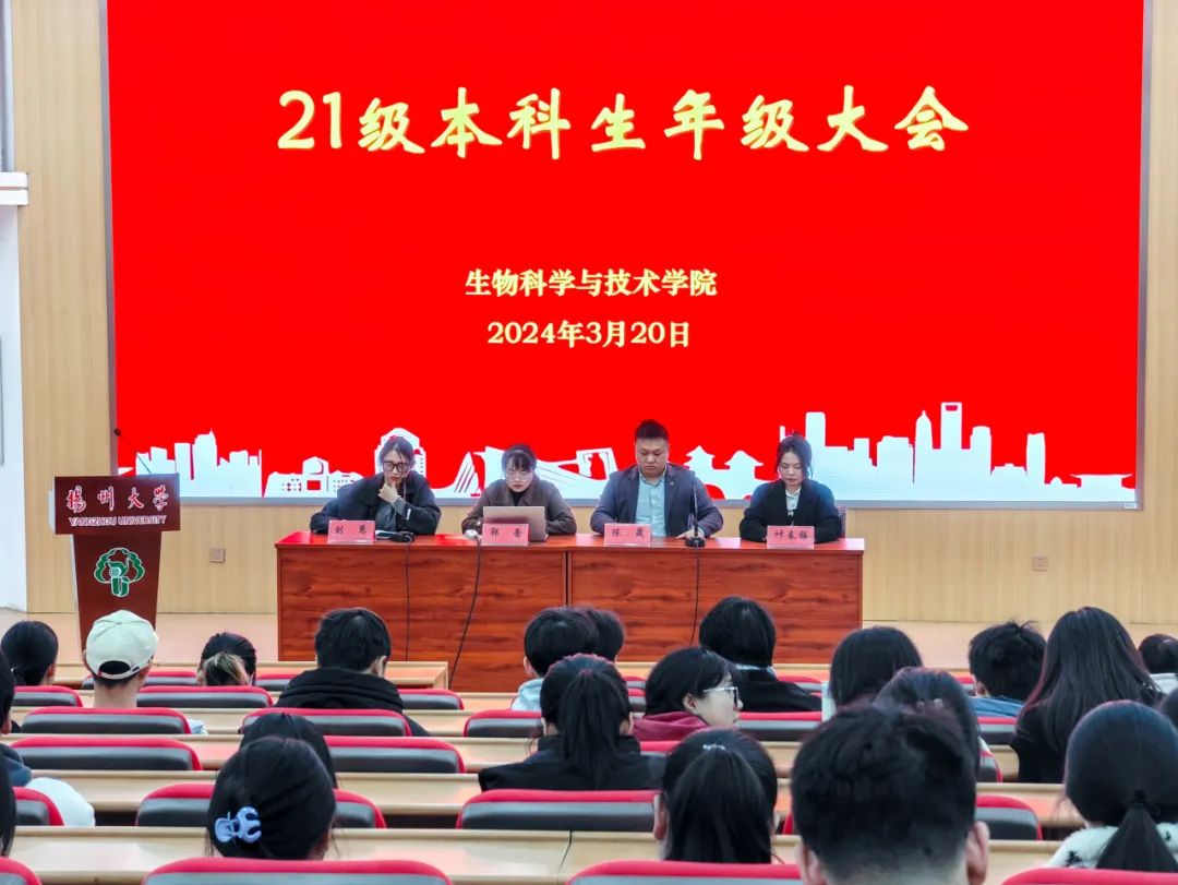3月20日,我院在荷花池校区逸夫图书馆报告厅召开2021级本科生年级大会,本次会议由院团委副书记郭蕾老师主持,辅导员陈晟老师、叶春梅老师、刘慧老师和2021级全体本科生出席了本次会议。